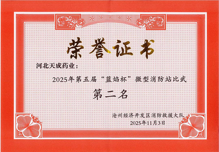 此次獲獎,既是一份榮譽,更是一份責任。天成藥業將持續強化微型消防站的建設與管理,筑牢企業安全生產的“第一道防線”,為公司的穩健發展保駕護航!