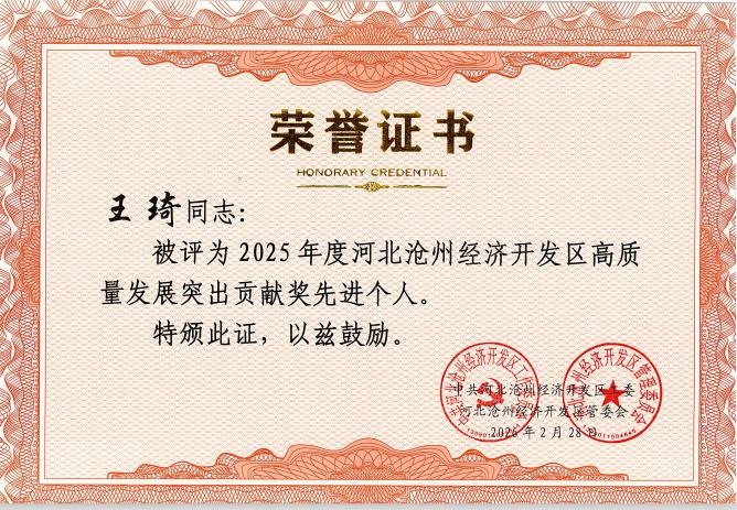 喜報|王琦榮獲滄州經濟開發區2025年度高質量發展突出貢獻獎先進個人